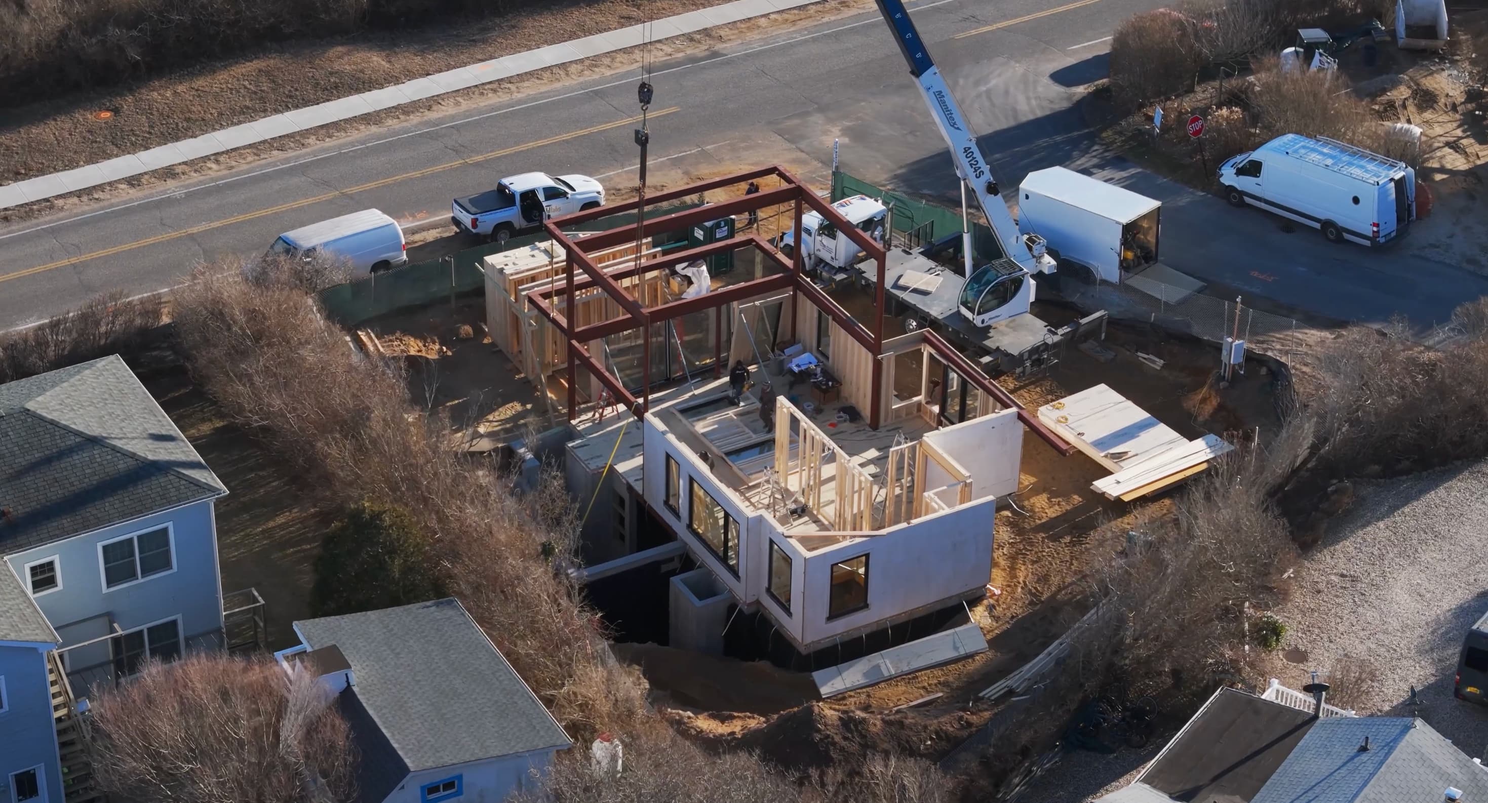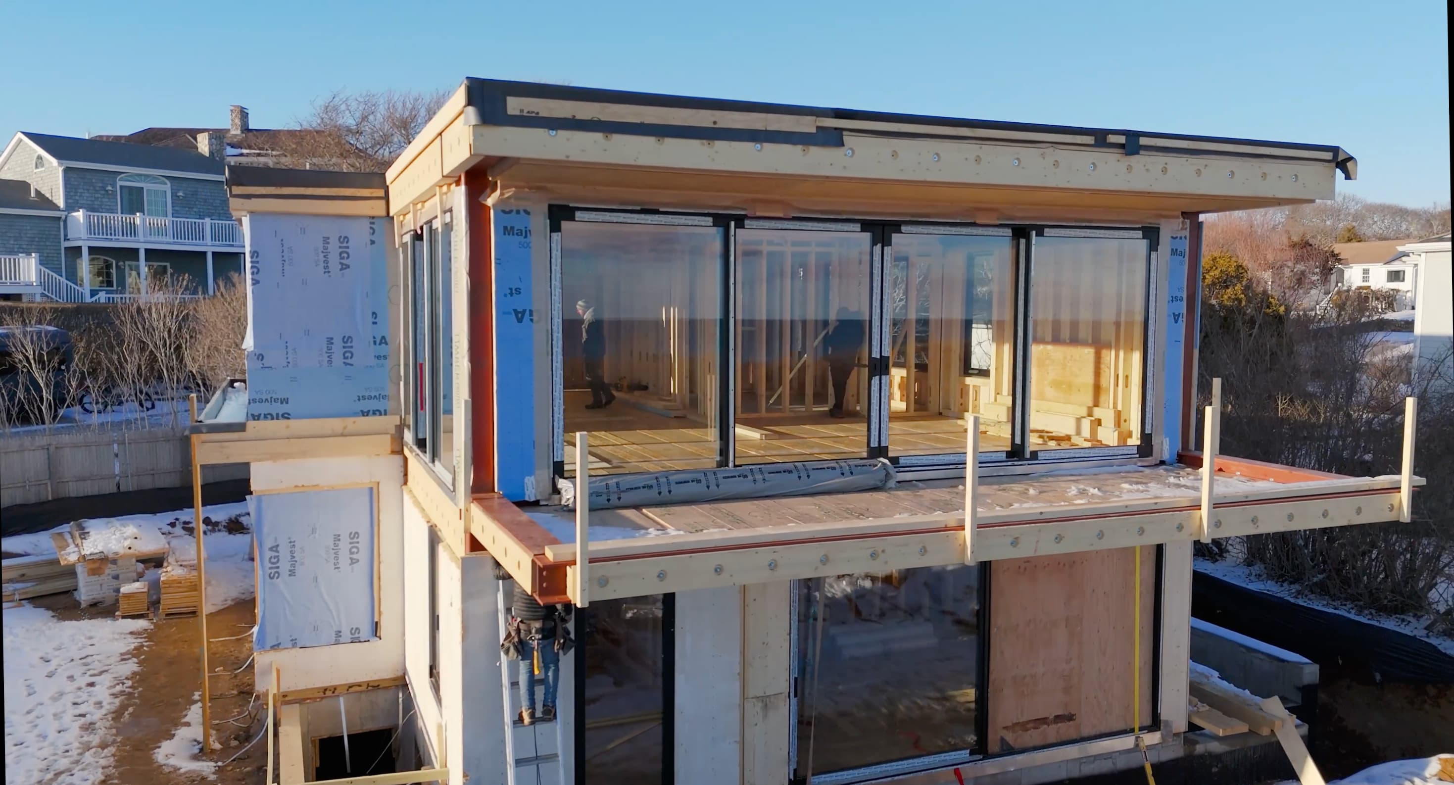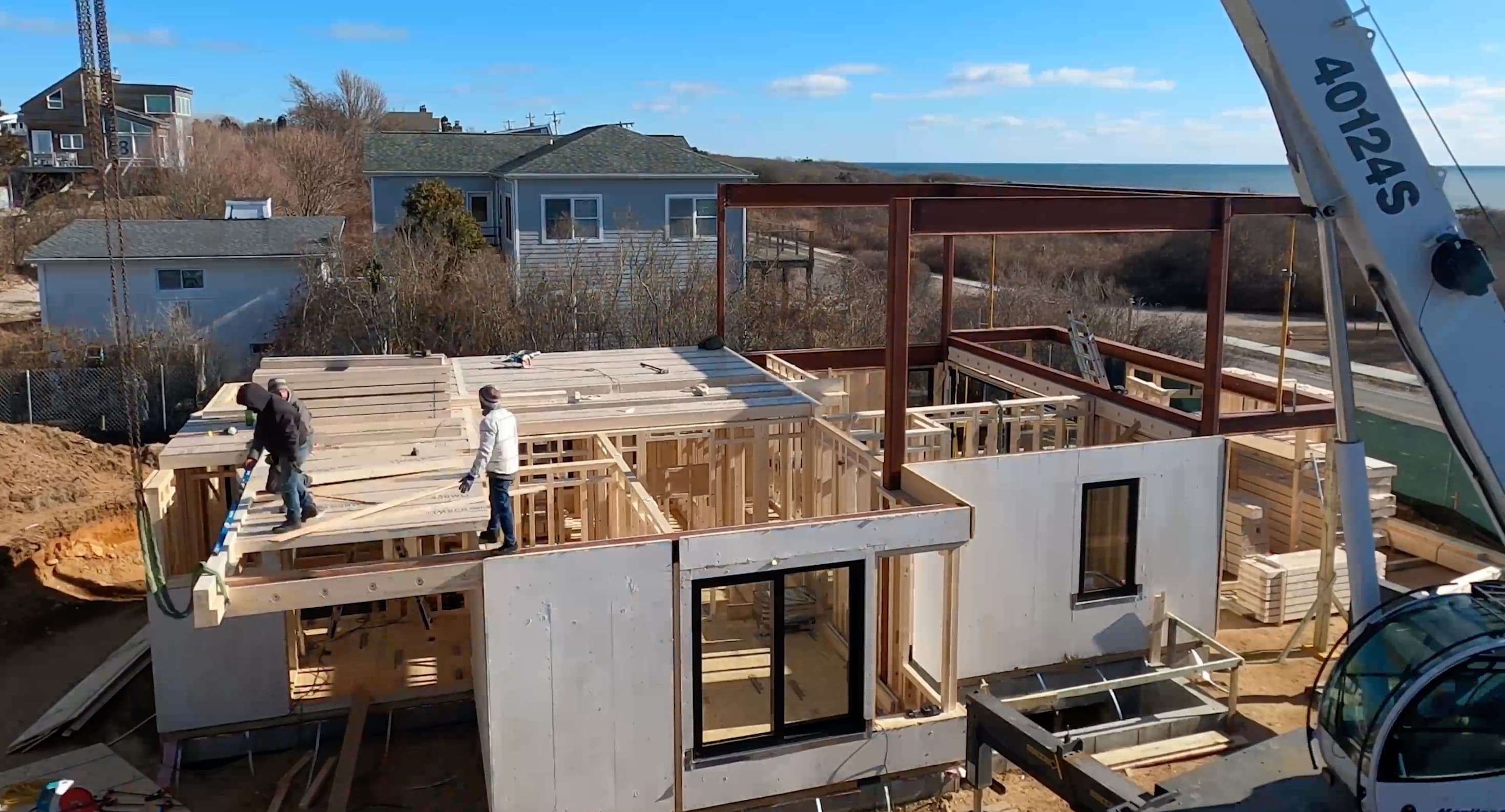 The home is a hybrid system rooted in craftsmanship and performance. A concrete foundation anchors the residence, while a predominantly timber frame—enhanced with strategic use of steel—creates structural strength, best-suited for waterfront builds. The first floor is constructed with cross-laminated timber (CLT), and the extensive use of mass timber throughout allows the home to blend seamlessly with Montauk’s coastal charm and surrounding natural landscape. The result is a residence that feels at once modern and organic.