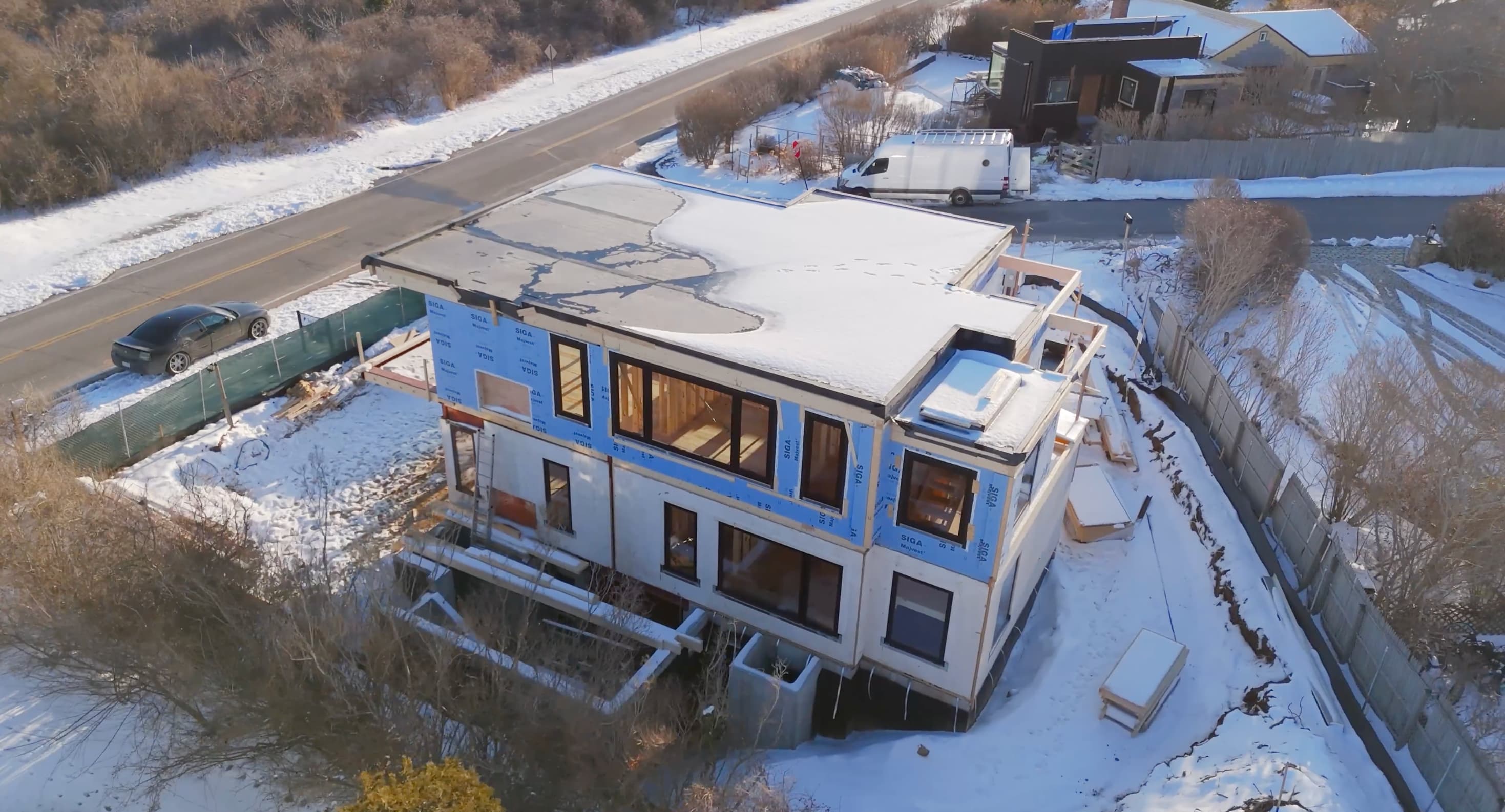 Rising two stories above a full basement, the home is positioned to capture sweeping views of the Atlantic. Old Montauk Highway, known as a wooded and winding alternative to Route 27, traces the shoreline from elevated bluffs and quiet beaches—offering dramatic vantage points that inform the home’s design and orientation.